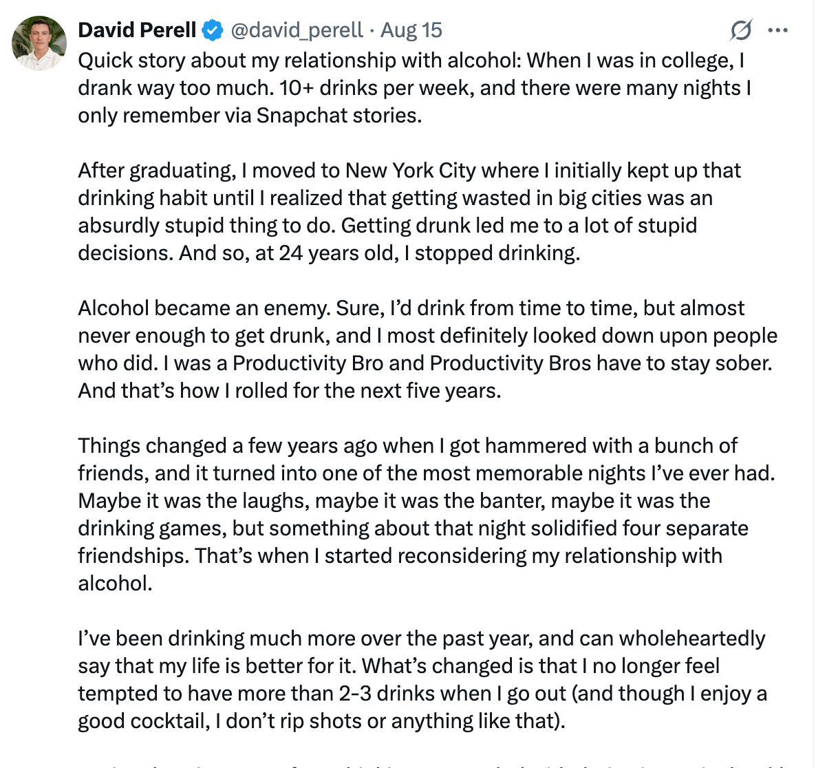 David Perell’s post on alcohol was one of the best things I’ve read in a long time. As someone who’s gone back and forth between being 100% sober and experimenting with various degrees of substance/alcohol consumption, his view on ‘a little bit of drinking’ helped me reflect more on what I want my relationship with alcohol to be.