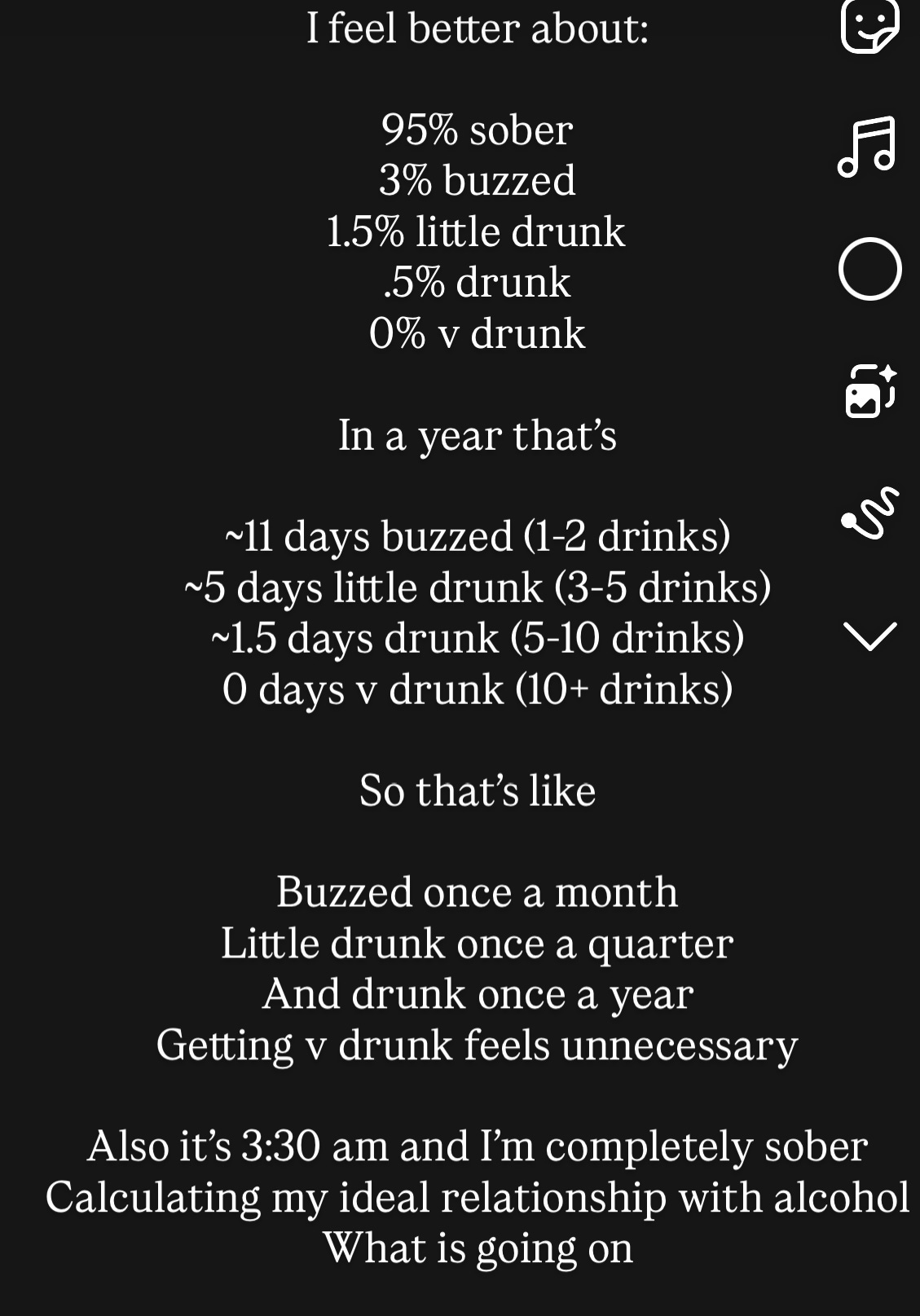 Since I couldn’t sleep and came across his post in the middle of the night, I ended up doing a reflection on what I want my ideal relationship with alcohol to look like. Here’s where I landed.